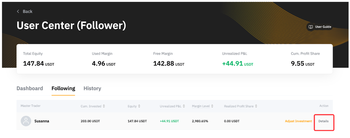 To cancel copying your Master Trader, go to User Center (Follower) → Following, and click on the Details of the respective Master Trader you wish to unfollow.