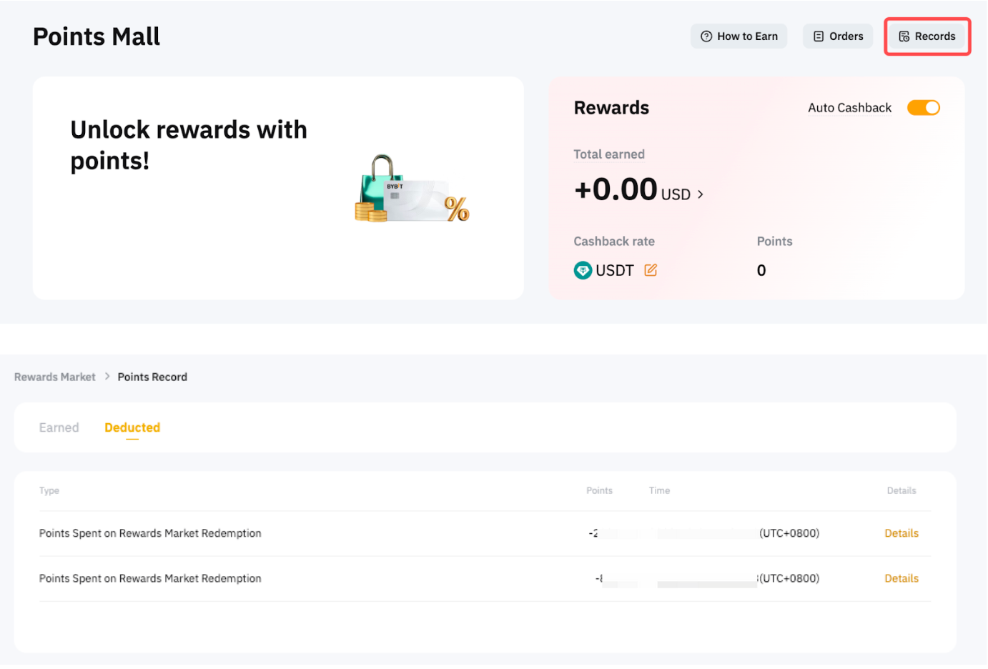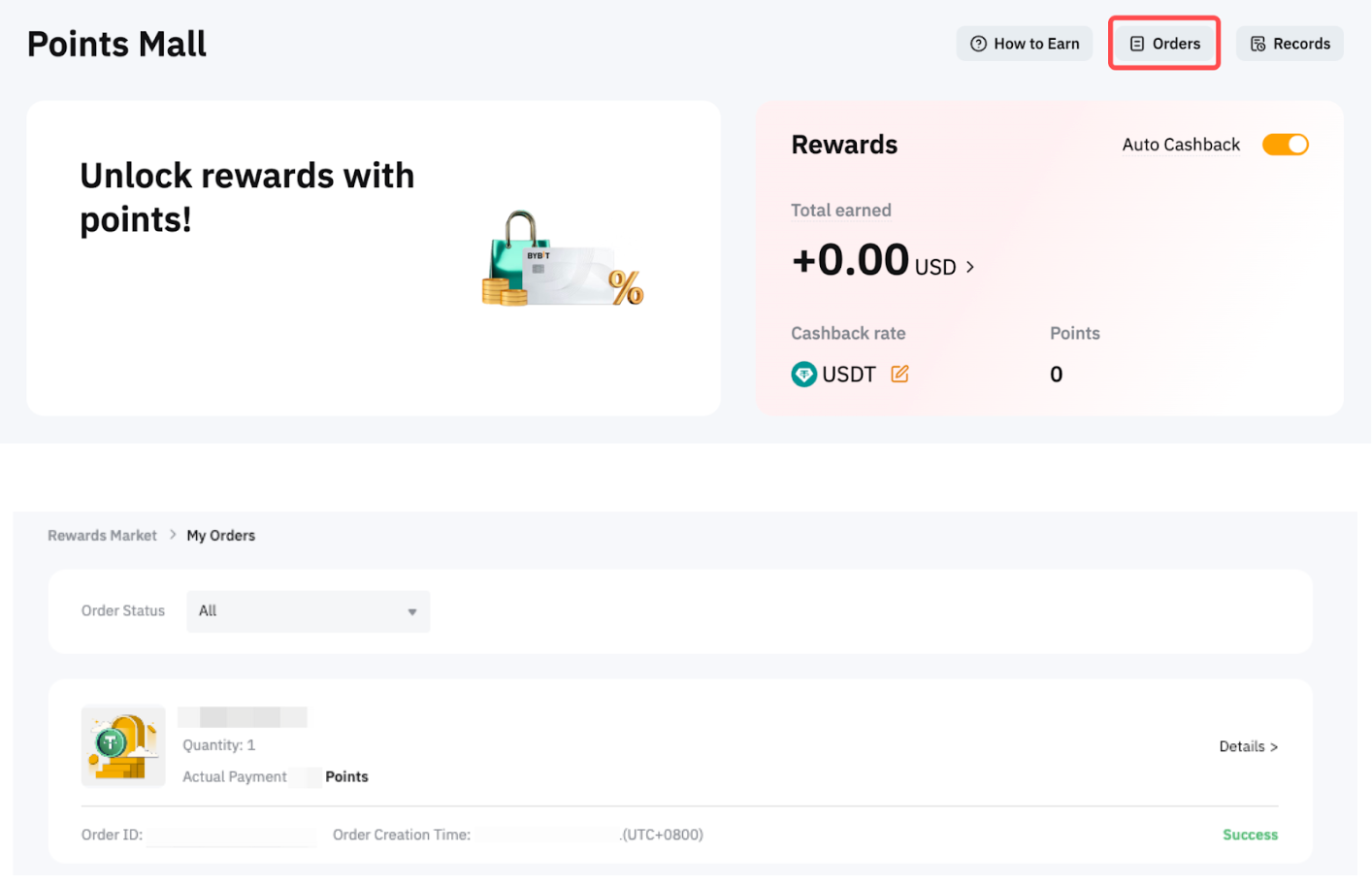 You can find your redemption status records on My Orders page. By clicking on Details, you can access all the information related to your redemption, including the order ID, creation time, completion time, coin type, currency, bonus amount, and point payment amount.