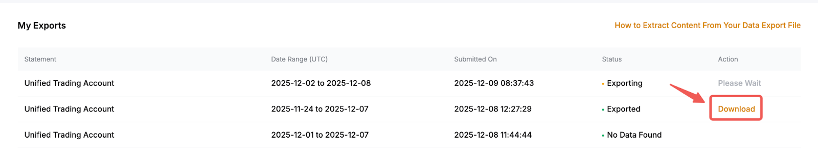 There are three different types of account data available for download on Bybit, with each capturing different aspects of trading activities and asset flows. These are namely Account Statement, Transaction Log, and Order History.