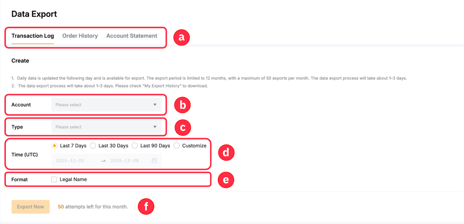 - Up to three (3) years of recent data can be retrieved. However, the export period is limited to one year (12 months), with a maximum of 50 exports per month for all the data types. For example, if you have requested data export for both Transaction Log and Account Statement, you will have 48 remaining exports within that month.
