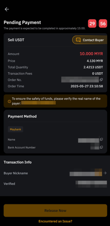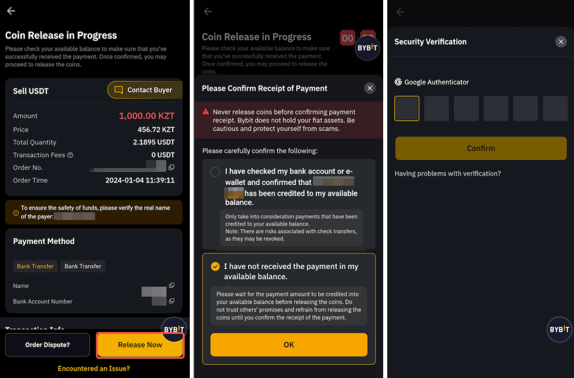 a. Once you’ve successfully received the payment from the buyer, click on Release Now to release your coins. You will be asked to confirm receipt of the payment from the buyer. Once clicked on Release Now, complete the security verification for confirmation.