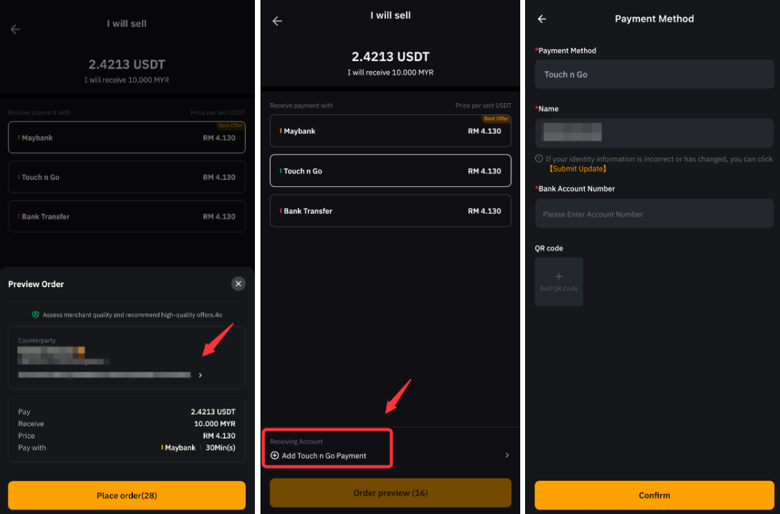 • The payment method listed by the advertiser will be shown. If you have not added the matched payment method, please add it by clicking the Add Payment Method button and filling in your payment receiving account.