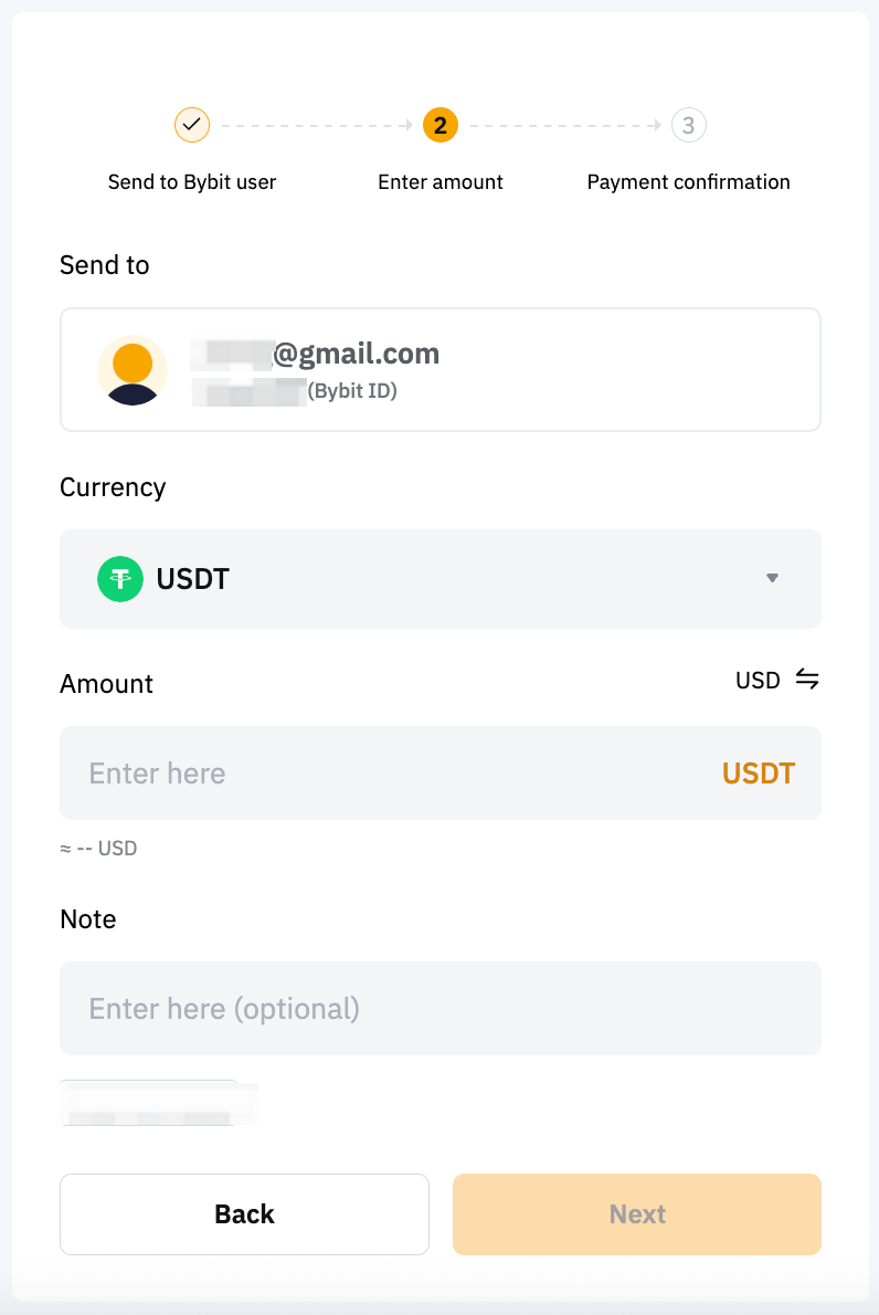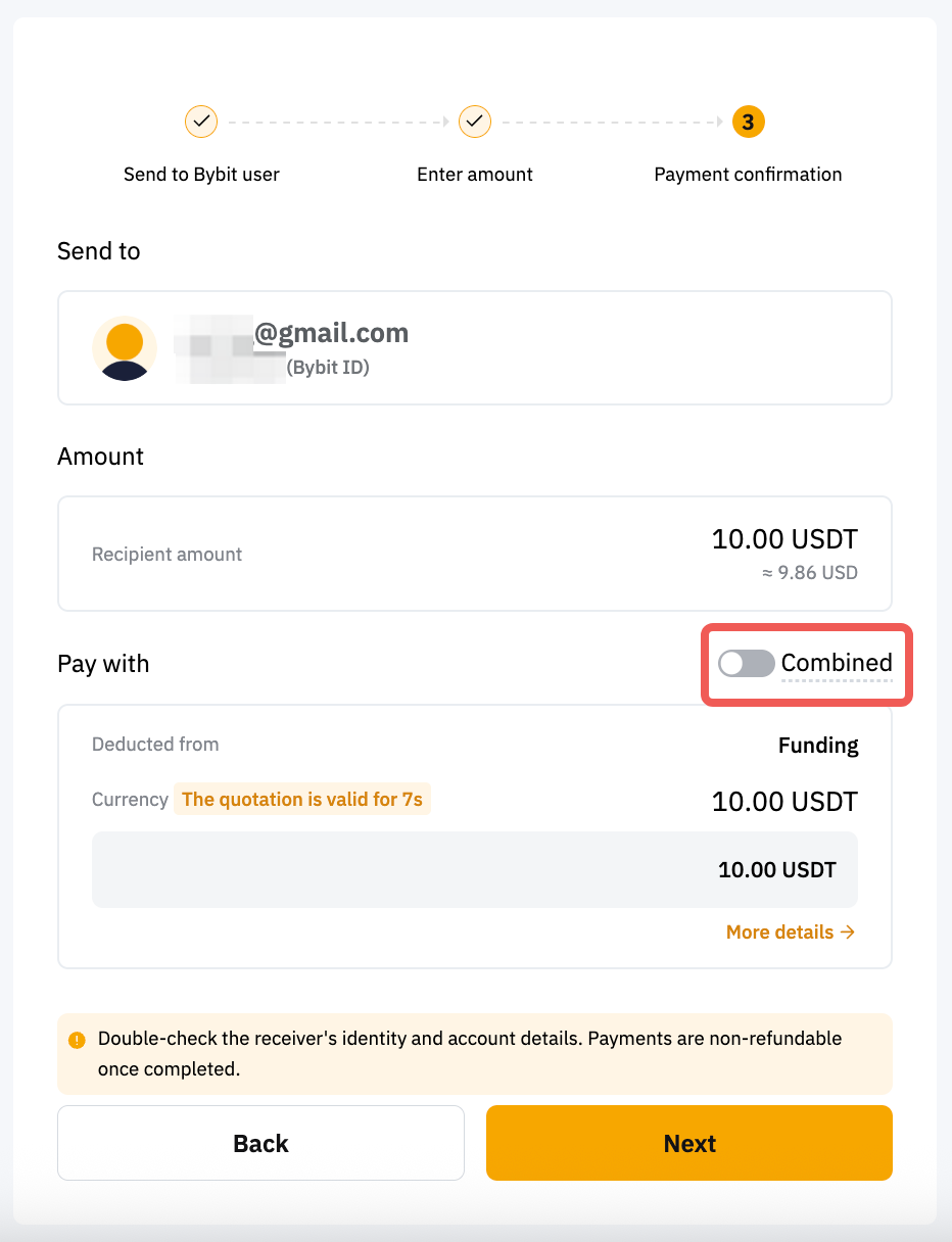 Step 2: Select the type of method for internal transfer payment. You can send the payment to the other Bybit Pay users by entering their: