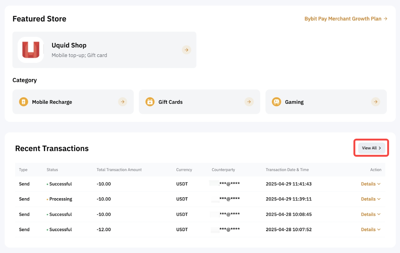To view your payment history, please head to Bybit Pay page, scroll to the bottom, and click View All. Alternatively, simply go to Pay Transaction History