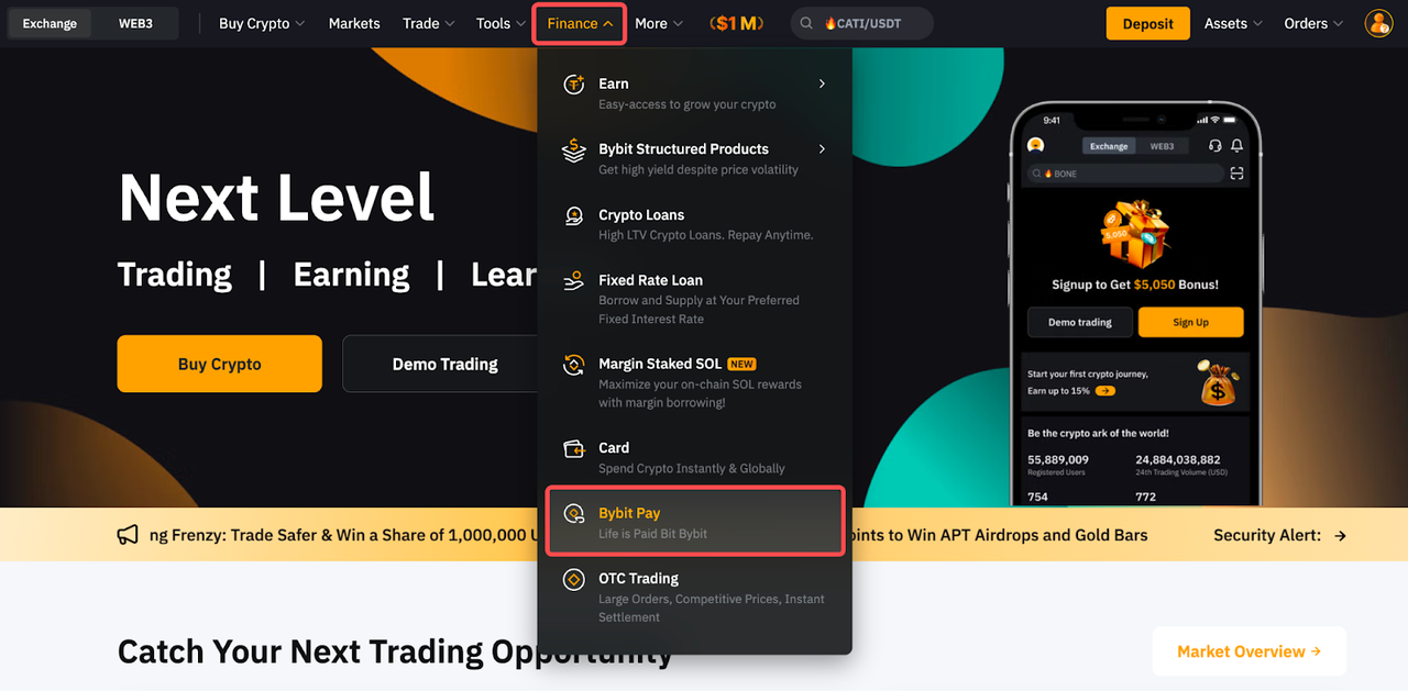 Step 1: From the Bybit homepage, click on Finance → Bybit Pay at the navigation bar to enter the Bybit Pay page. Then, click on the Send button.
