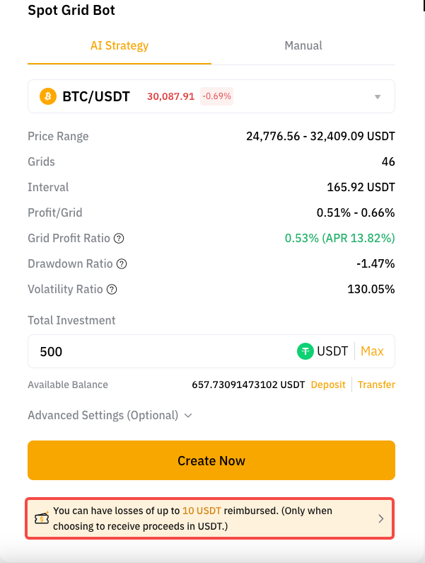 During the bot creation process, you'll be able to see the amount of your Loss Cover Voucher. Do note that the voucher only comes into effect upon the termination of the bot. Therefore, you will still need sufficient funds to operate your bot initially.