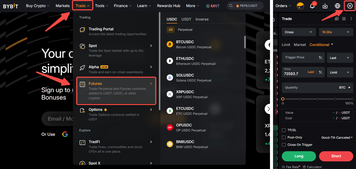 Step 1: On the Bybit website, go to Trade → Futures and click the Settings icon in the top-right corner.