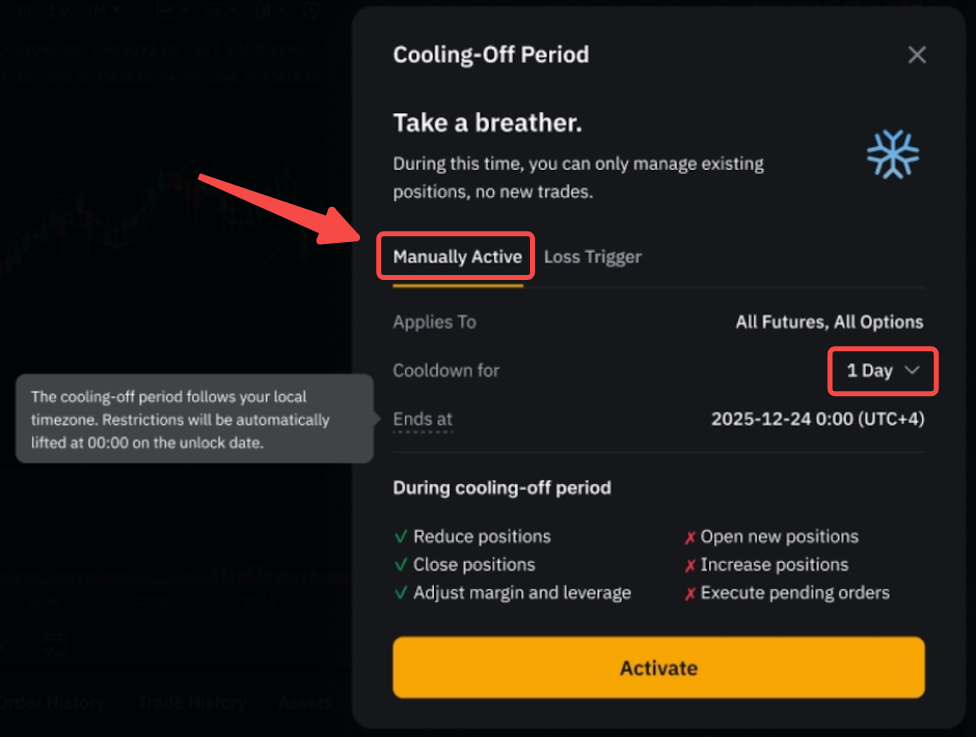 The Cooling-off Period is a risk management feature that you can activate to temporarily suspend Futures trading. It allows you to step away, reassess your strategy and avoid impulsive or emotionally driven decisions.