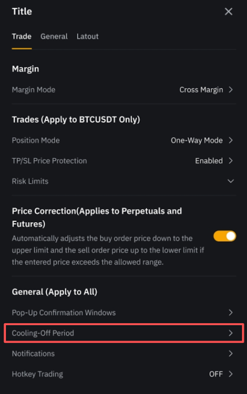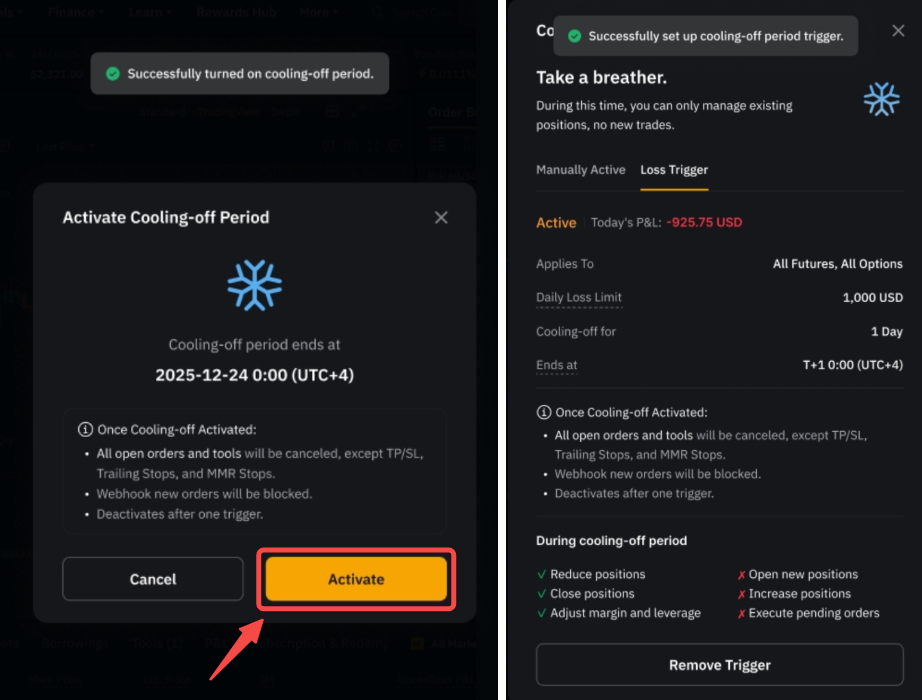— Once the Cooling-off Period is triggered, all open orders and trading tools will be canceled, except those that help reduce risk, such as TP/SL, Trailing Stop and MMR Close.