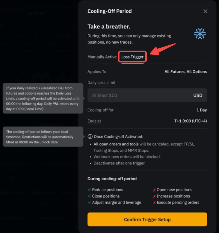 b) Loss Trigger: Set a daily loss limit to automatically trigger the Cooling-off Period when your daily P&L reaches that limit.