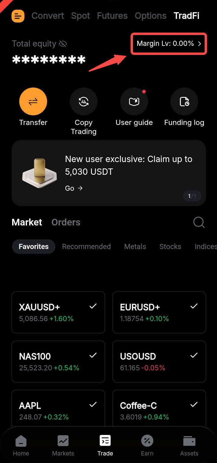 Margin Level for TradFi within the Bybit mobile app can be found at the Trades tab seen below.