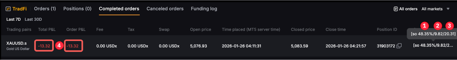 When the Margin Close-out is triggered on TradFi, it will be displayed in the following manner in the Completed Order tab.
