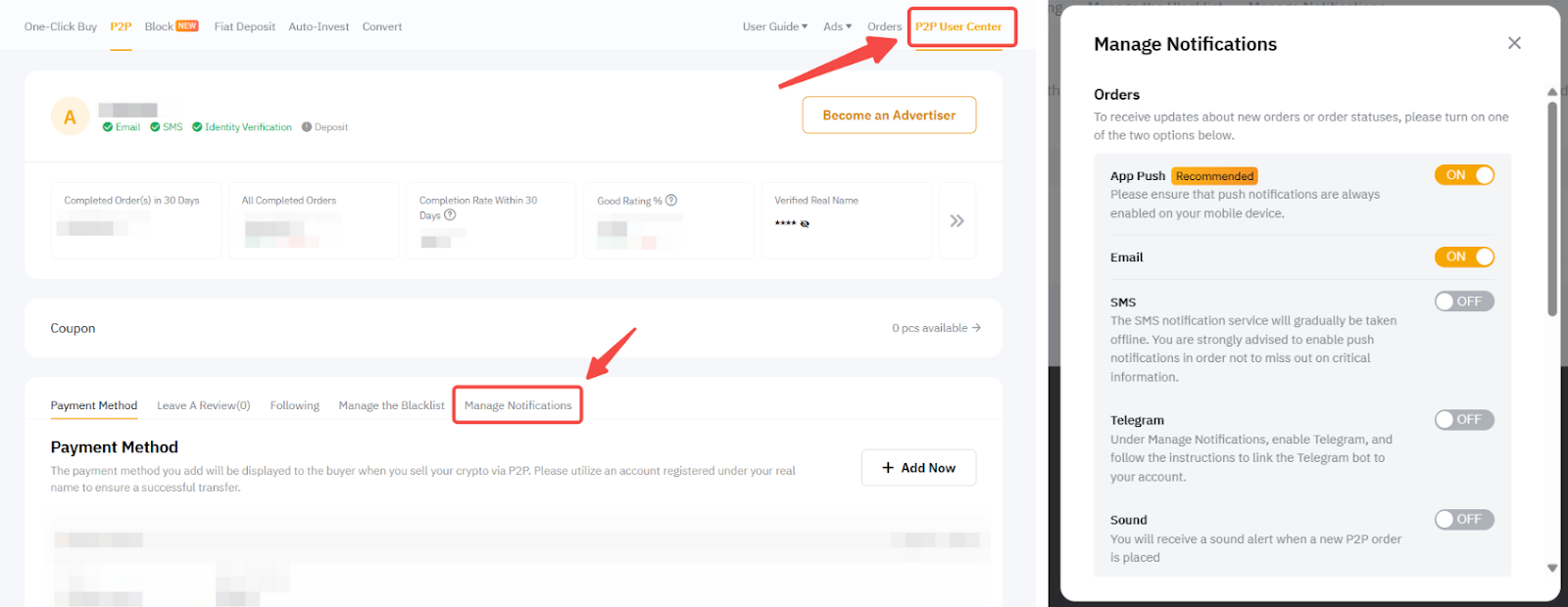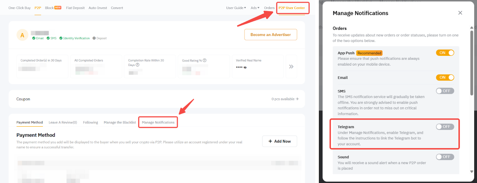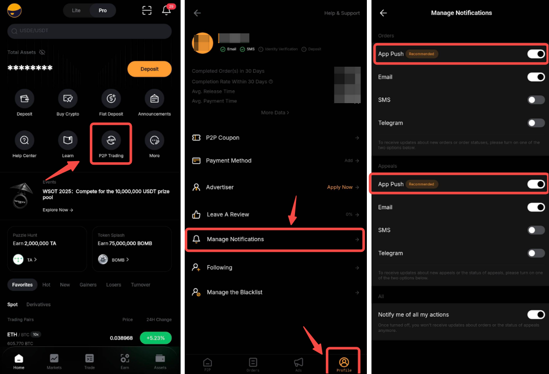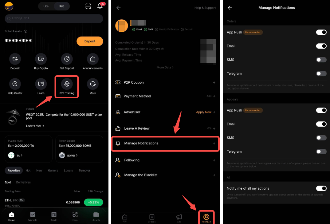 You can control the notifications such as App push, Telegram, email and SMS for P2P orders and appeals through the P2P User Center.