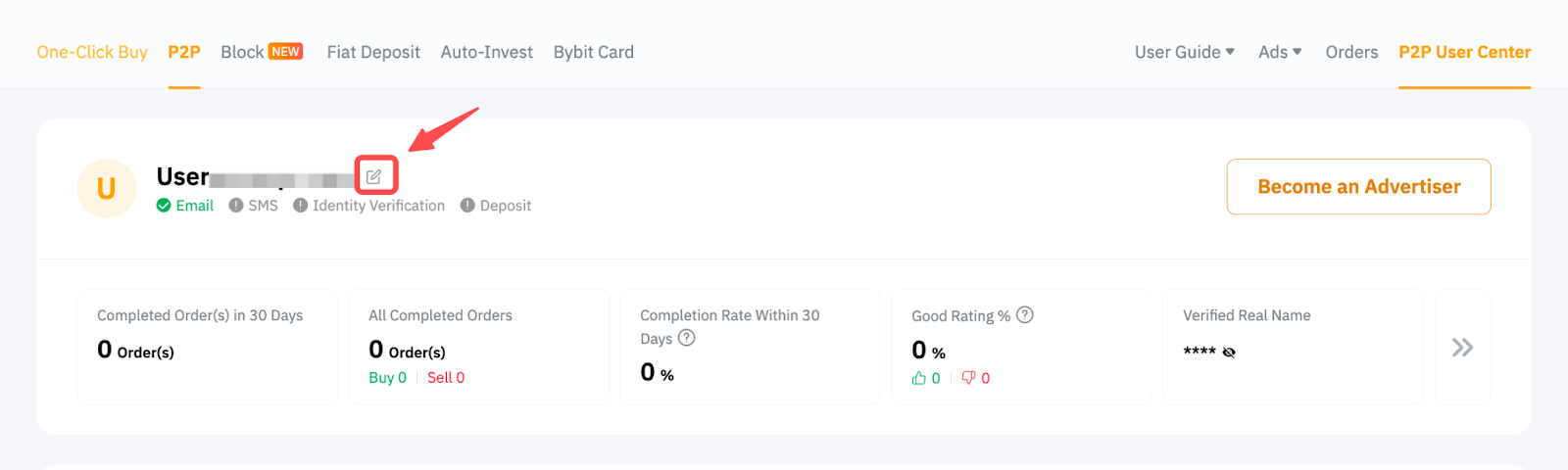 You can set your nickname by clicking on the Pencil icon on the P2P User Center. However, please note that spacing, special characters, and emojis are not allowed.