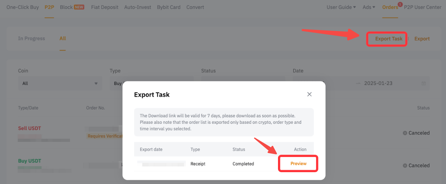 On the App, head to P2P Trading → Orders and tap on the Export icon. Then, select the export time range and format.