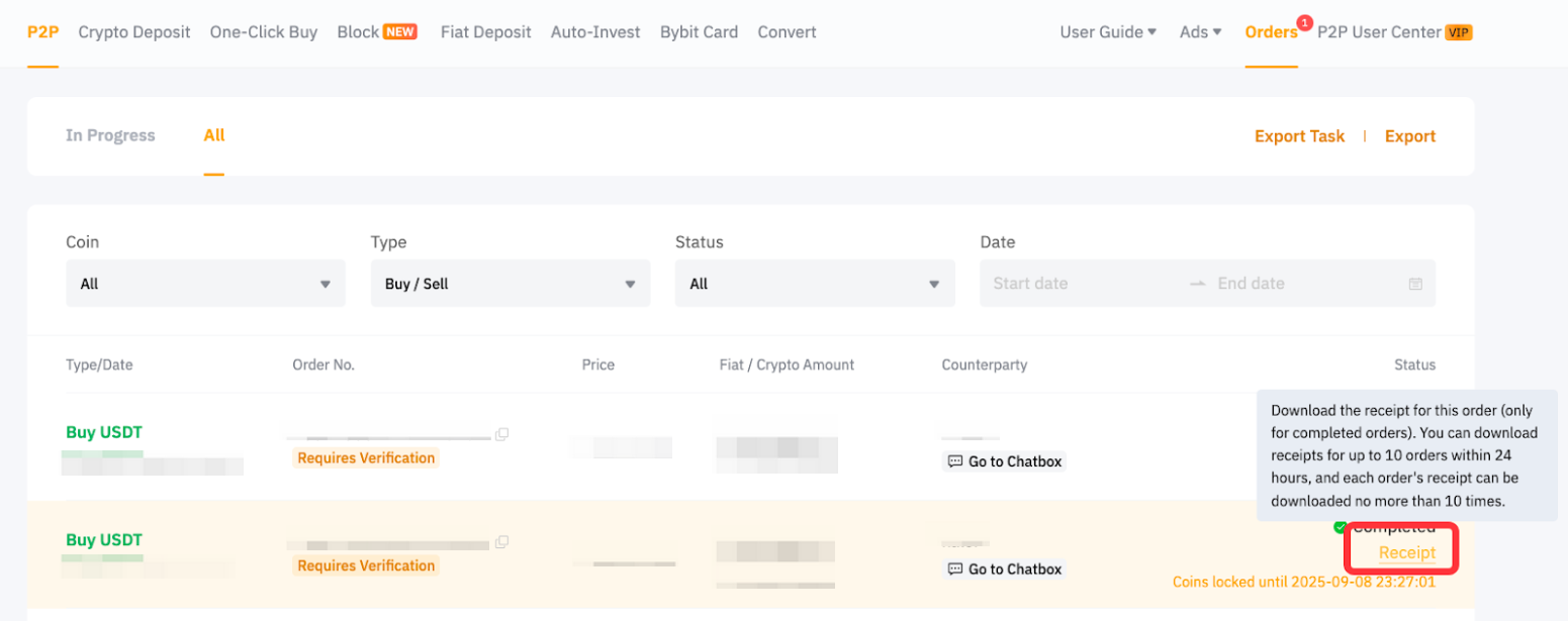Yes, you can download the P2P order receipt by clicking Receipt on the Order List page. The download function is available for completed orders and the receipts can only be downloaded from the Bybit website.