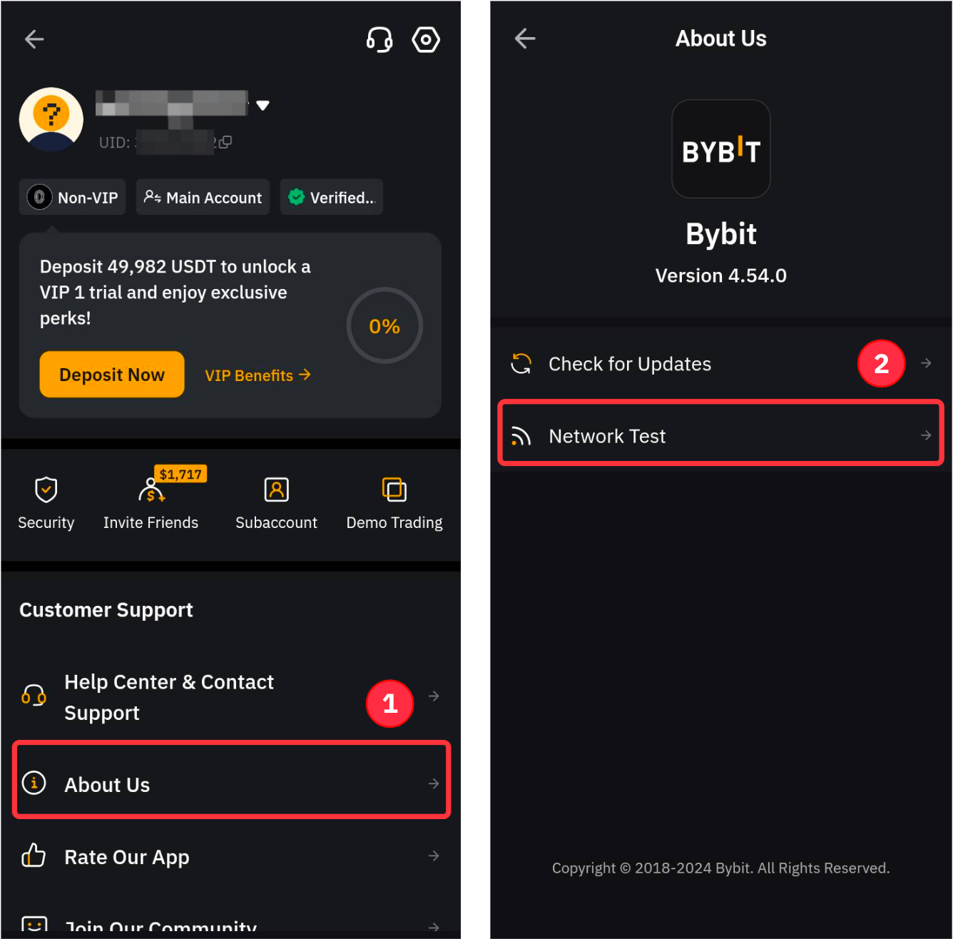 On the App, you can check your network by clicking on the profile icon at the top left corner of the homepage. Click on About Us → Network Test.