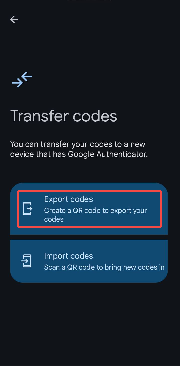 Tap on the Export codes option, then select an account to bring the code onto a new device via a QR scan.