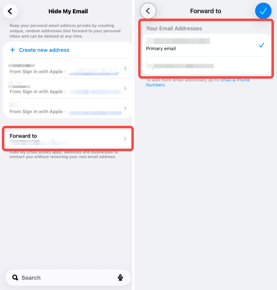 Next, tap Forward to and select the personal email account you selected when creating that Apple-generated email.
