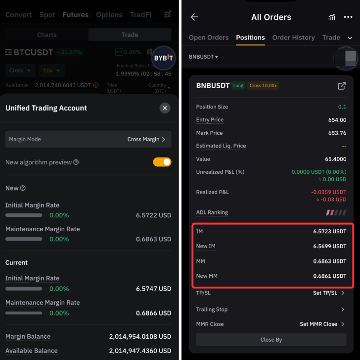 The new IMR and MMR appear in the account area, while position-level IM and MM are shown in the position area.